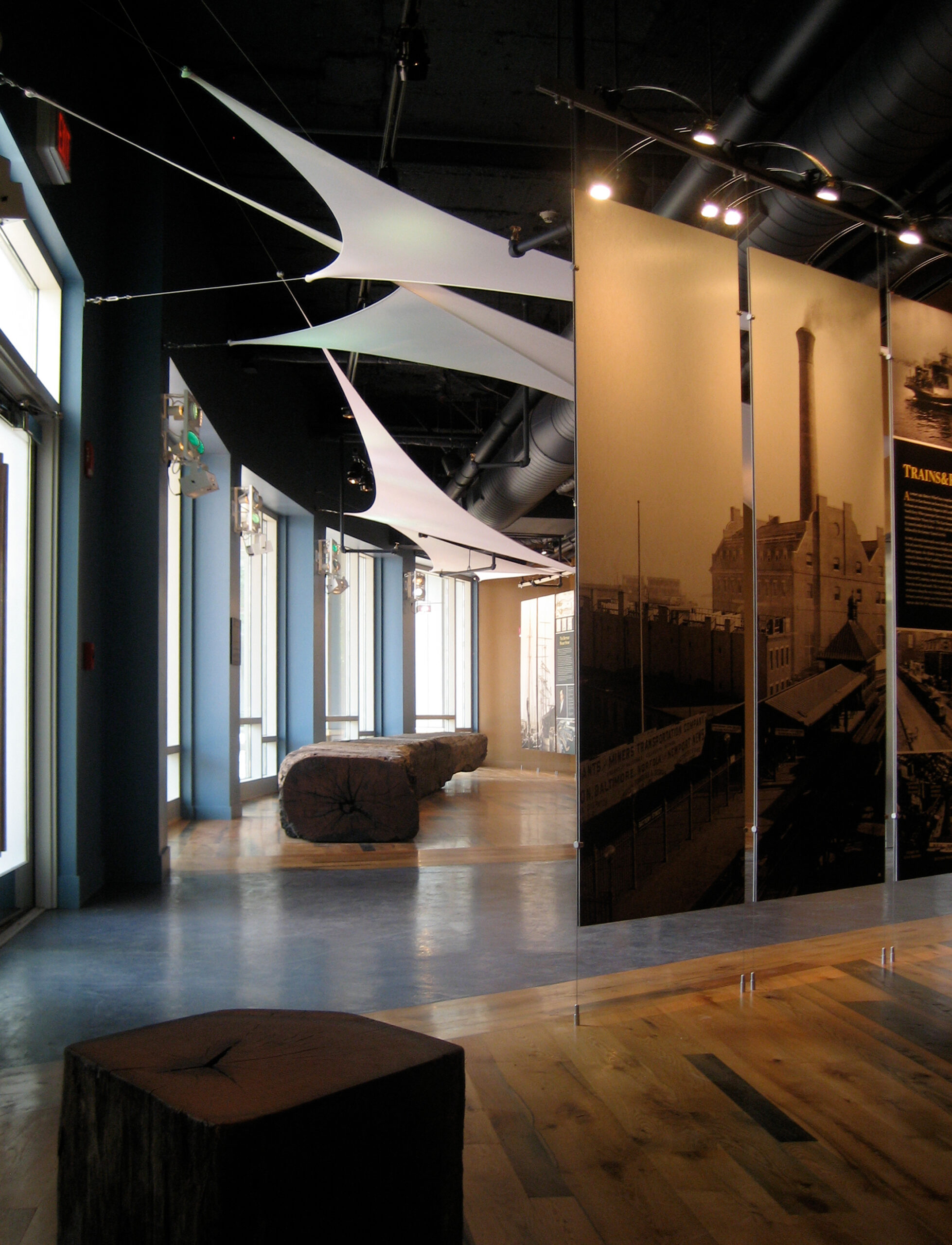 Within the museum, light and subtle wave imagery create atmosphere, while a 37-foot live oak timber anchors the space as both artifact and gathering place. The outdoor Harborwalk panels have been called “the most beautiful and informative signage on Boston’s Waterfront.”